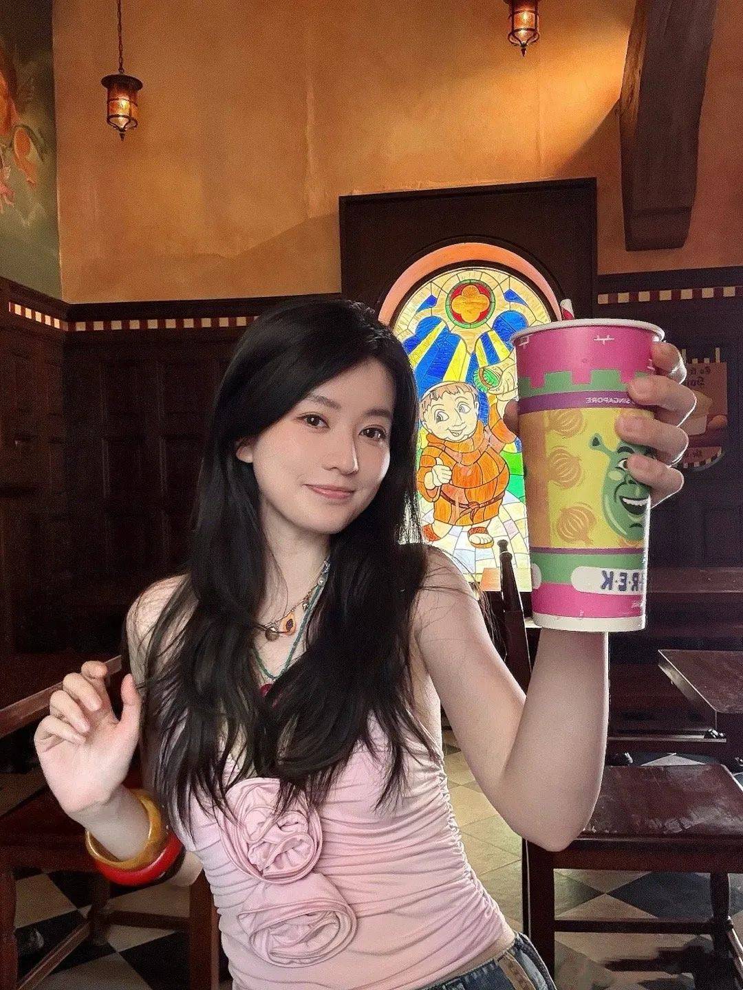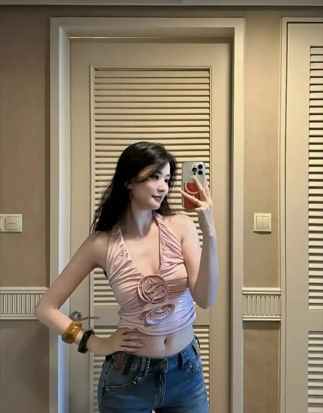 从曝出的图片能看到,乔欣当天穿了一件粉色的挂脖吊带短上衣,搭配了一条紧身牛仔裤,披散着一头黑长直秀发,美得清新脱俗,整套造型不仅很有设计感,还很高级。