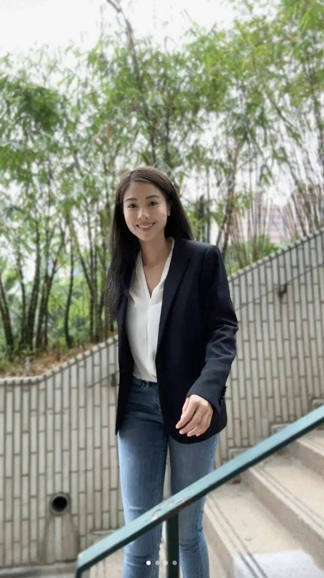 在港大出席座谈会当天,伍乐怡身穿一件西装外套搭配白色衬衣,穿上牛仔裤的她看上去干练又显年龄。