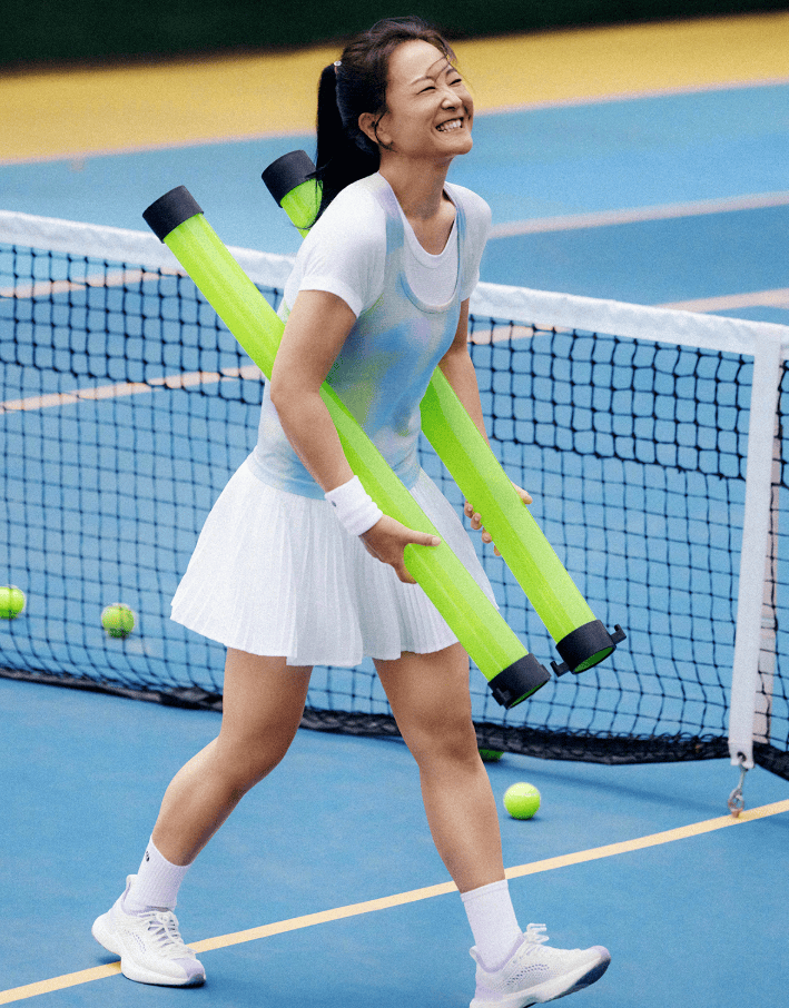 贾玲显然也是接触网球没多久,但在场上跑得比谁都欢,挥拍捡球相当卖力,漏球之后也能开朗大笑,沉浸在运动的快乐之中。